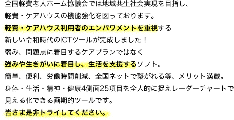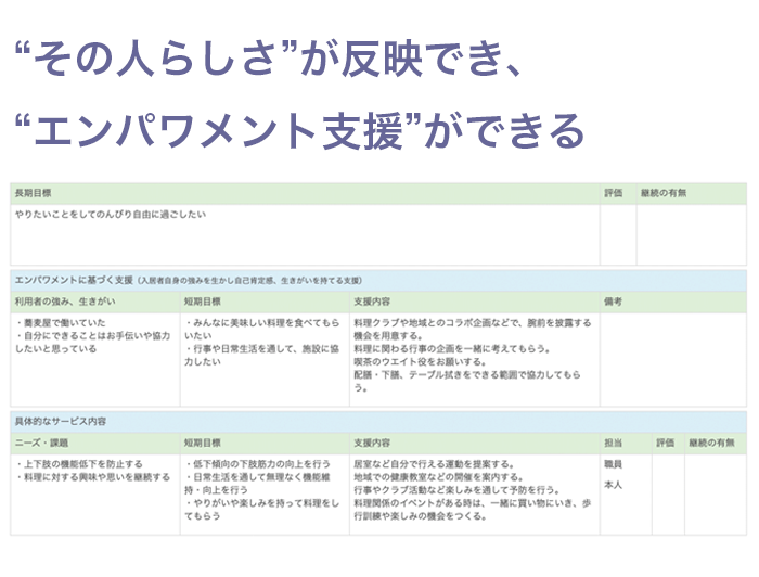 一般社団法人 全国軽費老人ホーム協議会 ICT活用 その人らしさを重視した個別支援計画書「あなたらしさ応援プラン」(以下「本サービス」といいます。)は株式会社E-item(以下「当社」といいます。)がインターネットを通じて提供する介護・生活支援業務システム「CareGrowth」の機能の一部を使用して提供するサービスとなります。